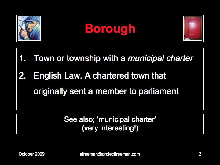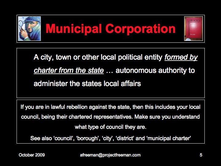 A Freeman has found through experience that like a Borough, a 'City' is a chartered corporation and treats all its 'Registered Persons' as part of its corporation, bound by its rules