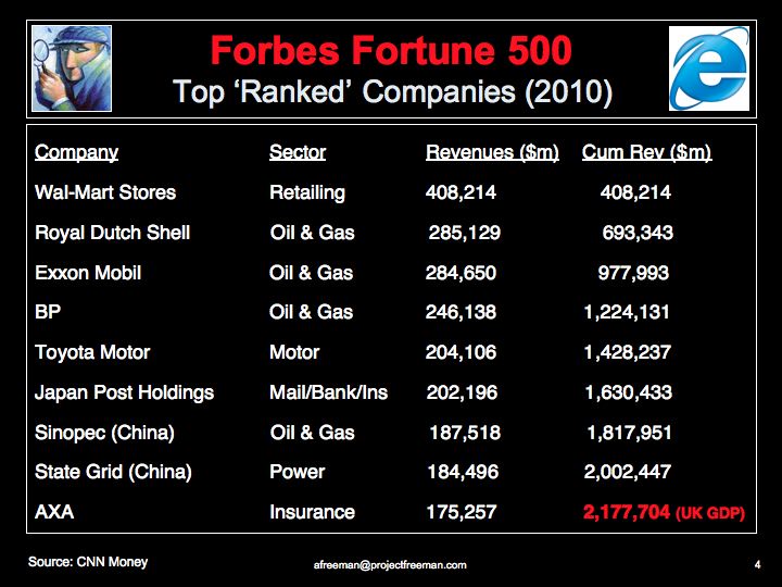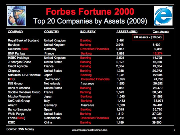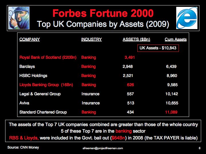 ...we see that even though RBS is the company with THE BIGGEST VALUE of assets in the world, with nearly $3.5 Trillion, it still took a big "Government Bail-out" (actually using Debt that the Tax Payer is liable for) in 2008