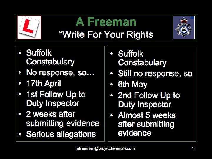 Notice here that the DCI had replied to my letter THE SAME DAY he received it. Maybe this was suddenly amazing efficiency taking place at Suffolk Police? 'A Freeman' suspects however it was because he HAD to reply speedily to the allegations made against him as evidence of him "putting the record straight" (from his point of view) in case this should ever reach a common law (de jure) court