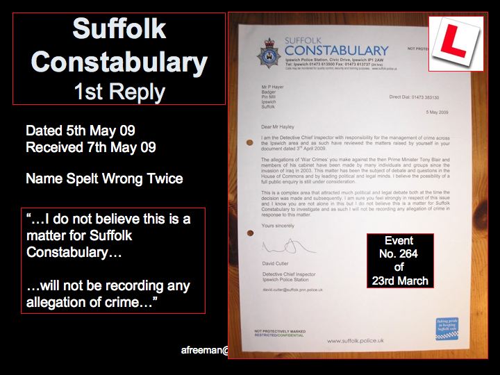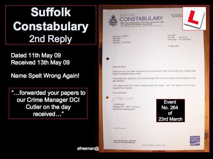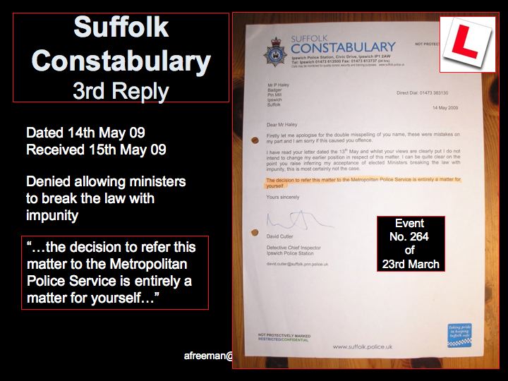 So, rejected by Suffolk Constabulary's failure to fulfil their duties (in 'A Freeman's' opinion) the crimes were then reported to The Metropolitan Police